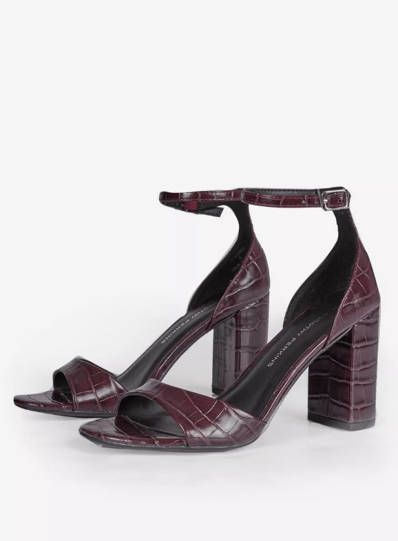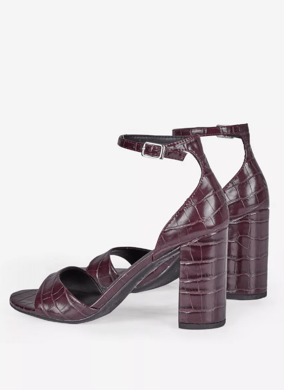 Burgundy crocodile design two part block heeled sandals with buckle. Heel height is approximately 8.8cm. 100% Polyurethane.