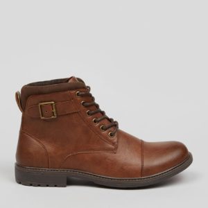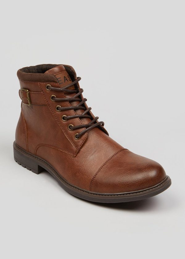 Ideal for dress-down days and weekend outings, these military boots put comfort at the forefront without compromising on style. Constructed from tan PU, design features include a lace-up front fastening, alongside rand stitch detailing, a side buckle and a cushioned cuff for maximum comfort. A chunky cleated sole provides added sturdiness and good grip.